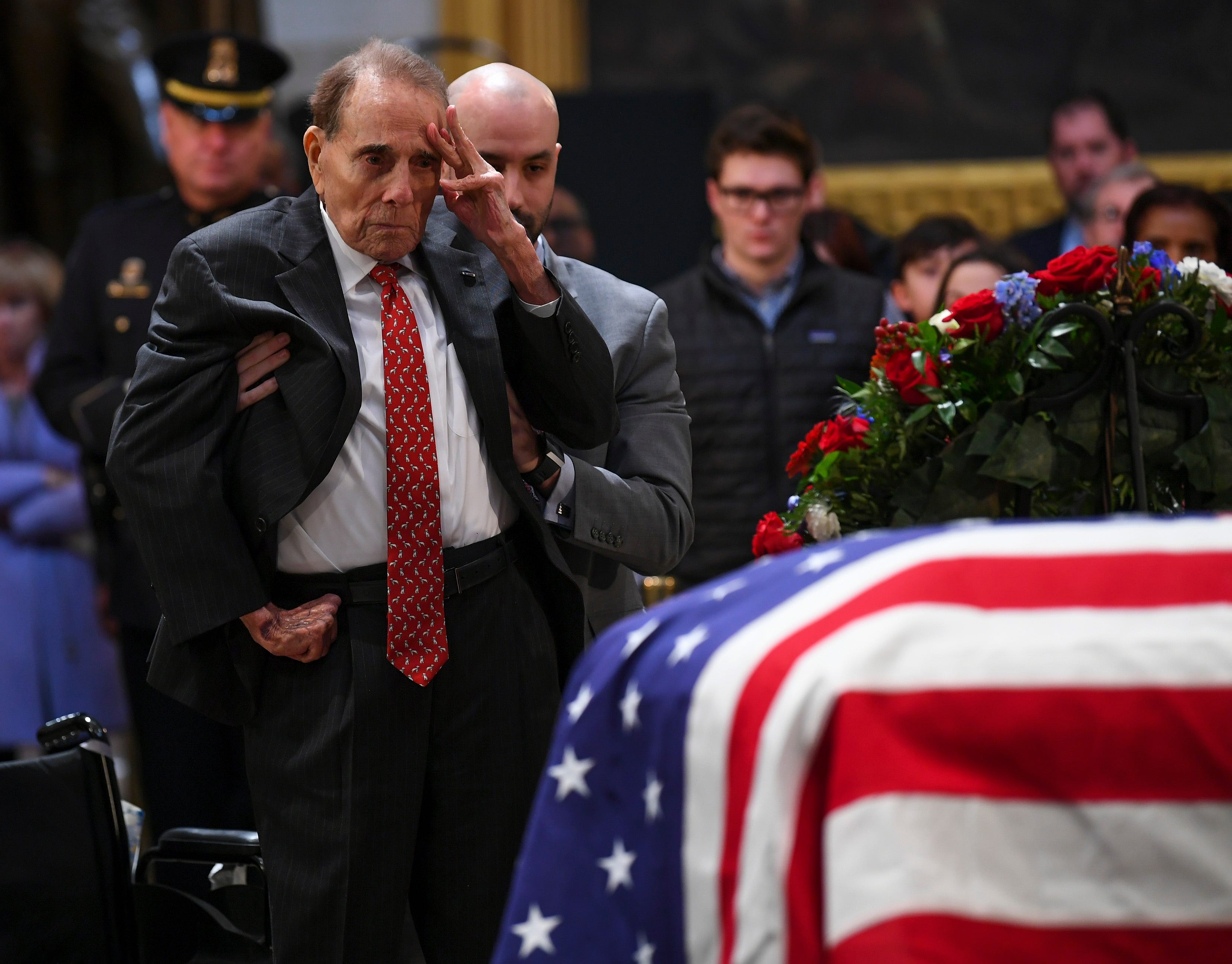Bob Dole, 95, was helped to salute former President Bush, his opponent in the 1988 presidential election and fellow World War II veteran. from USATODAY - News Top Stories https://ift.tt/2Ee7pbF